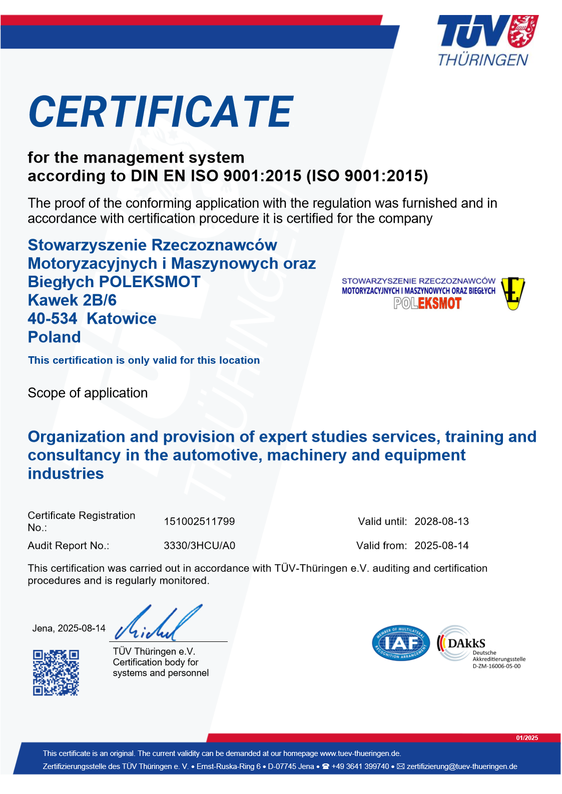 Certyfikat dla Systemu Zarządzania w/g DIN EN ISO 9001:2015 (ISO 9001:2015)
